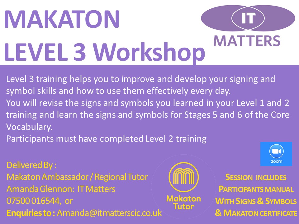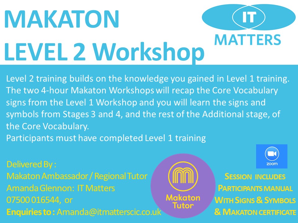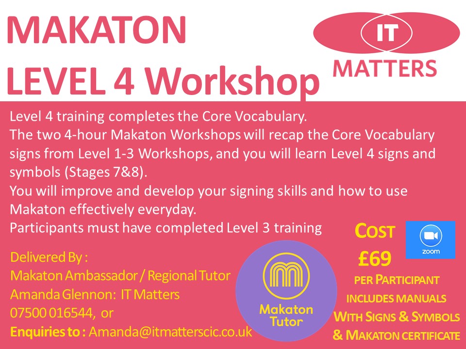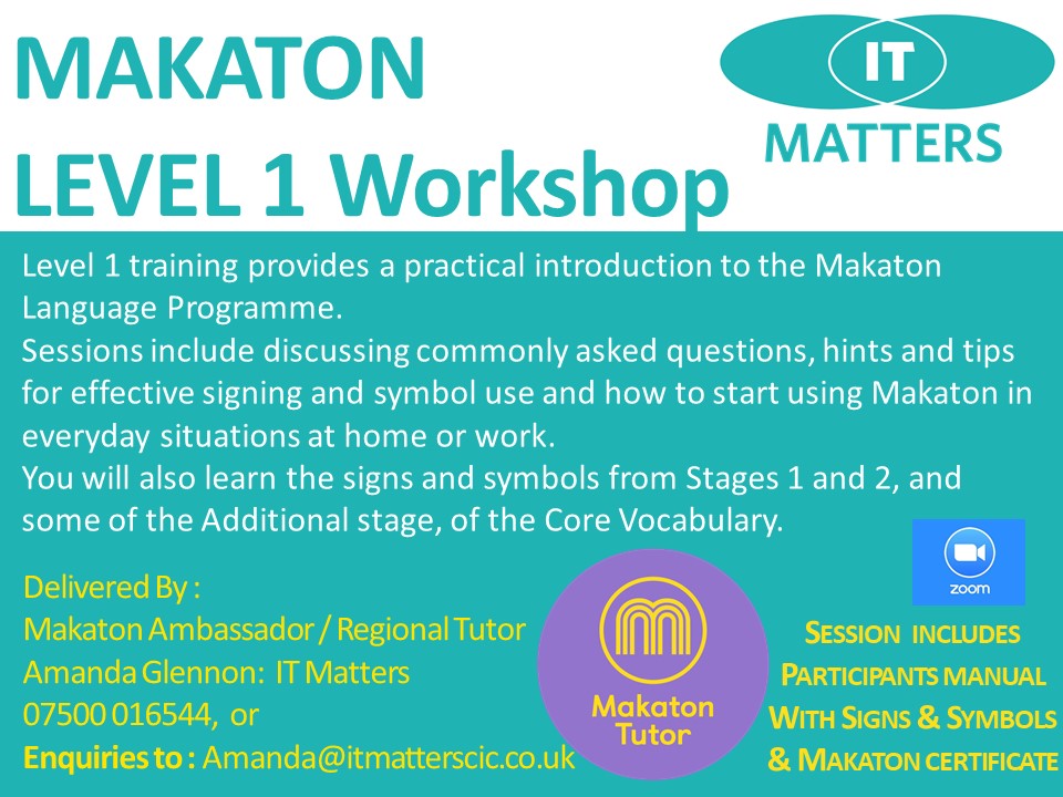 Makaton Levels 1-4 To register interest for future workshops for a group or individual booking please contact Amanda@itmatterscic.co.uk Share this: Click to share on X (Opens in new window) X Click to share on Facebook (Opens in new window) Facebook Like Loading...
