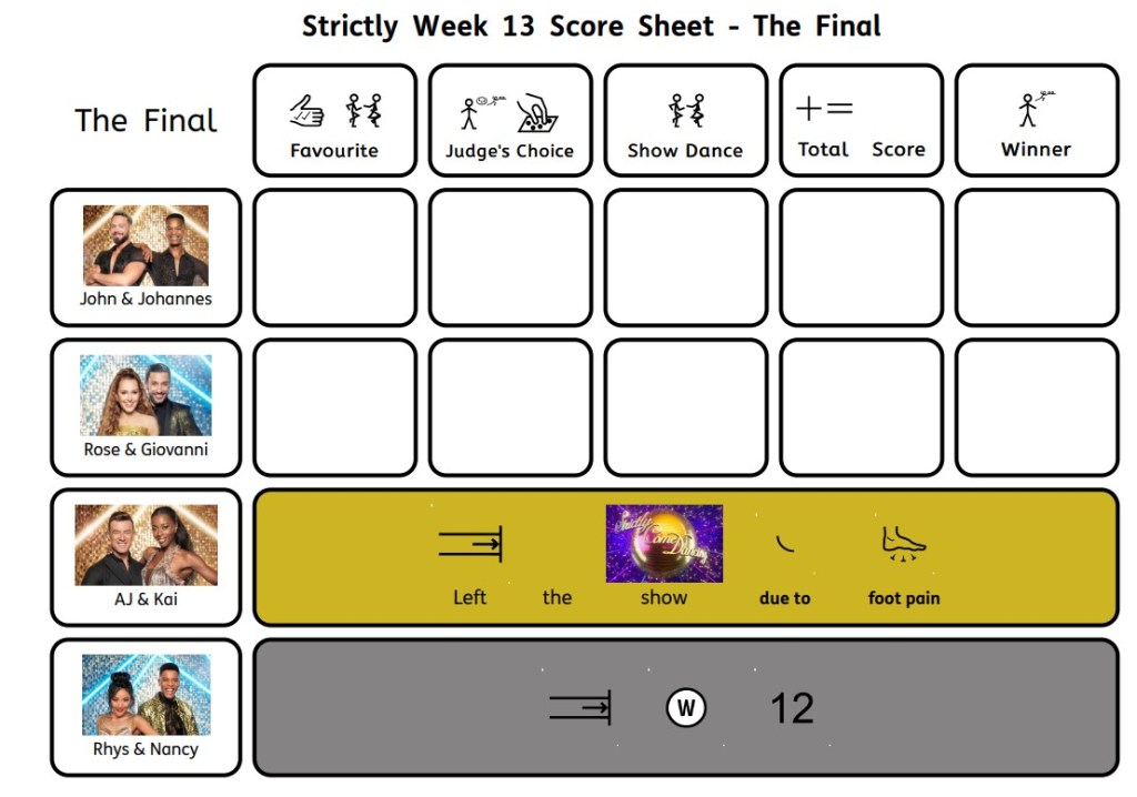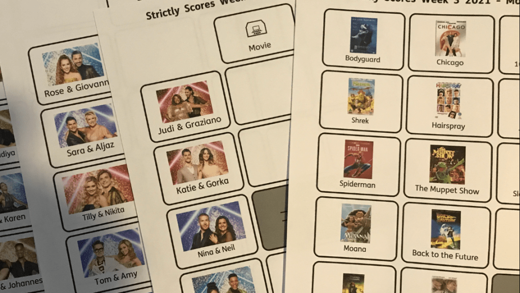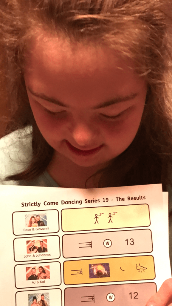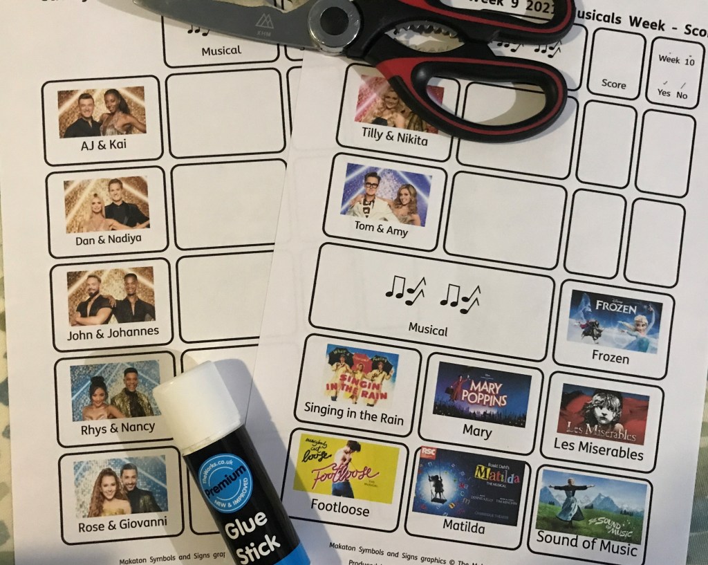 Our score sheet that we use at home has Makaton symbols to show what the celebrities really do – so we can get to know them a bit more…but this download doesn’t have the symbols due to copyright…you can take our lead and draw them on yourselves – a good preshow activity.