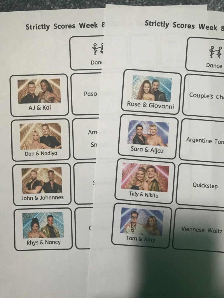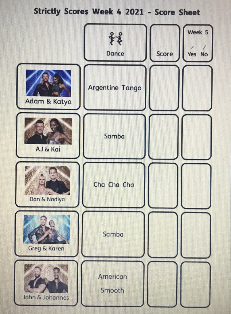 Saturday 22nd September is the start of the dancing competition, and to help us follow and remember what is happening and who is with who ( there are so many dance couples at the beginning!) we have a score sheet all ready for week 1.