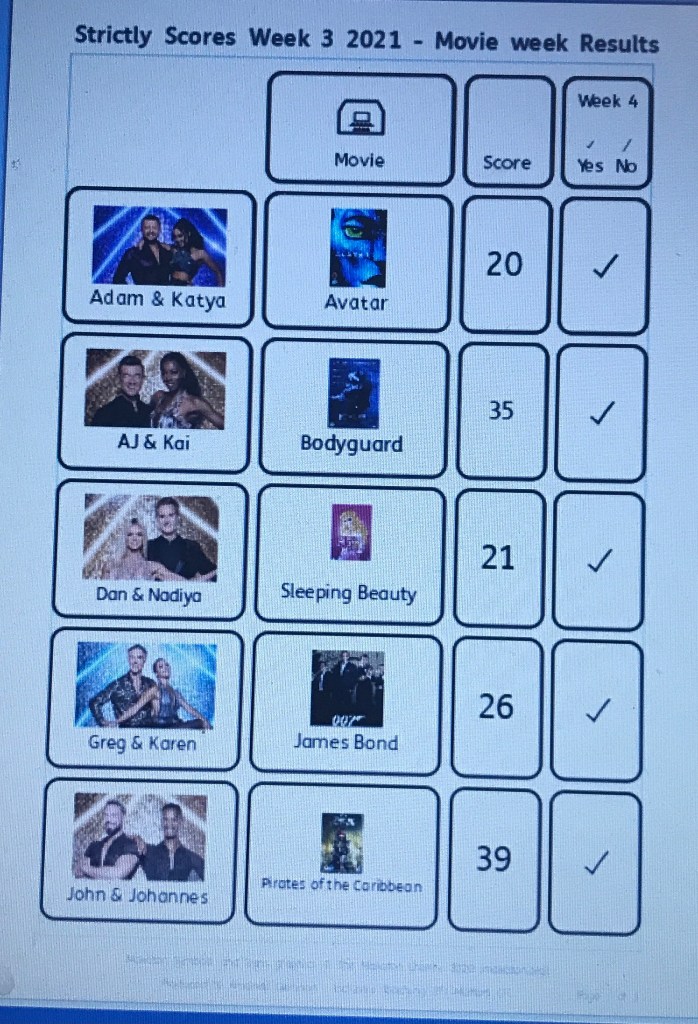 Simply note the scores, and tick who is in the dance off and who are winners ( through to the next week) Exciting stuff!