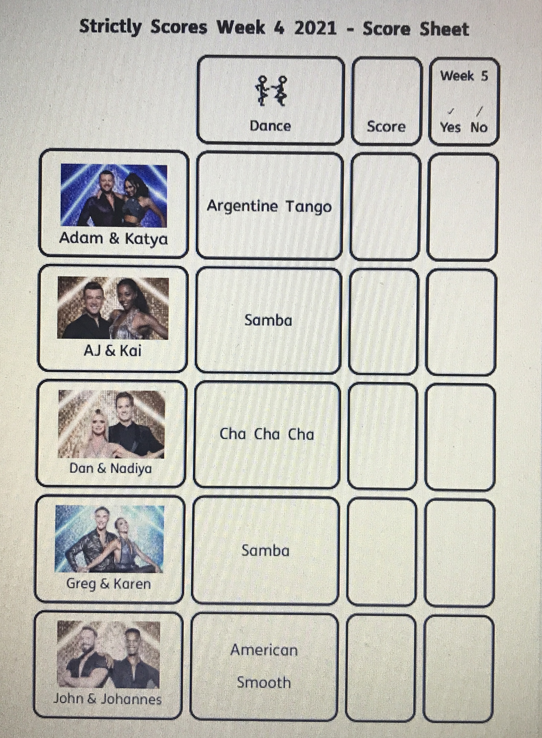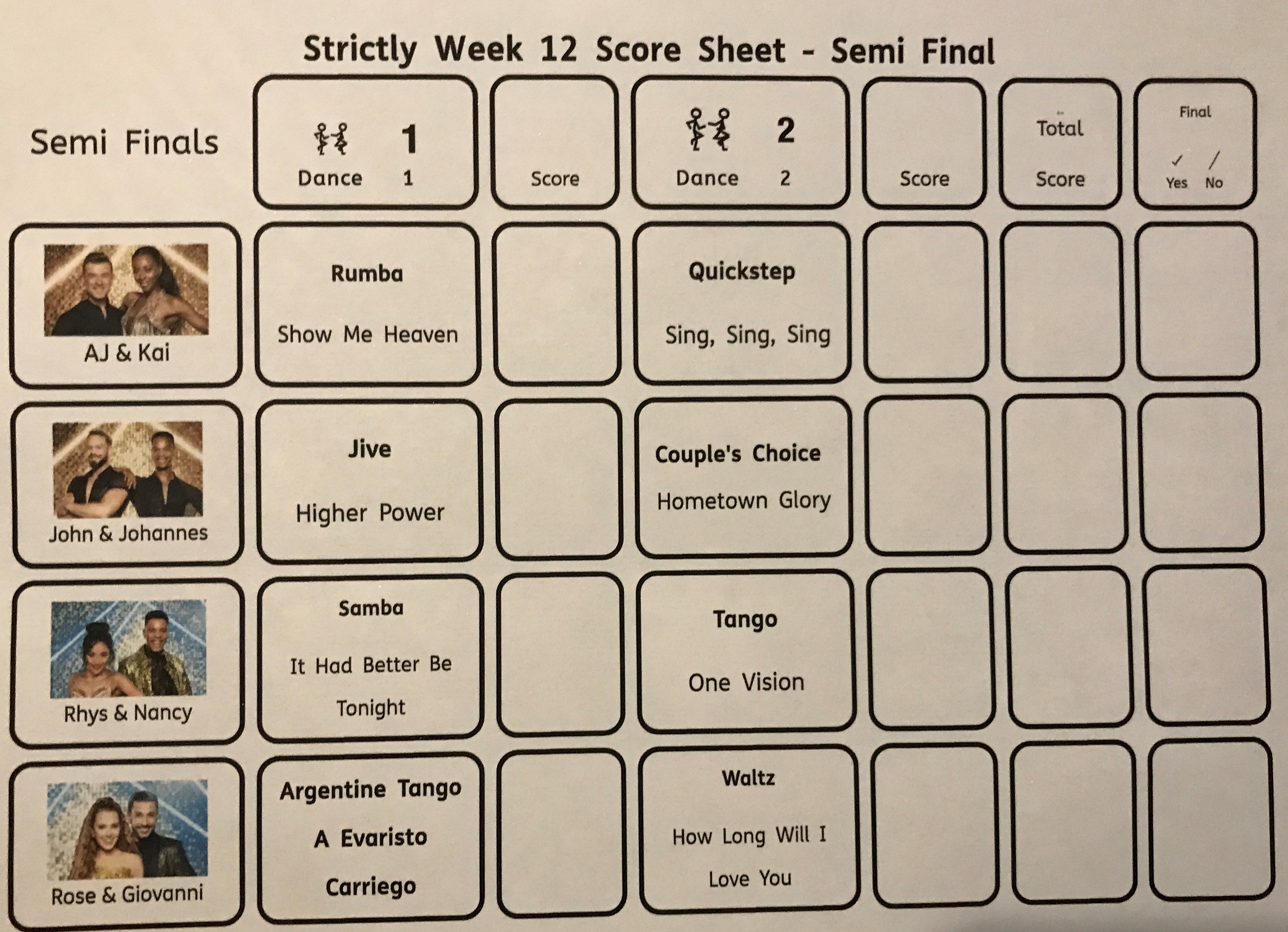 Saturday 22nd September is the start of the dancing competition, and to help us follow and remember what is happening and who is with who ( there are so many dance couples at the beginning!) we have a score sheet all ready for week 1.