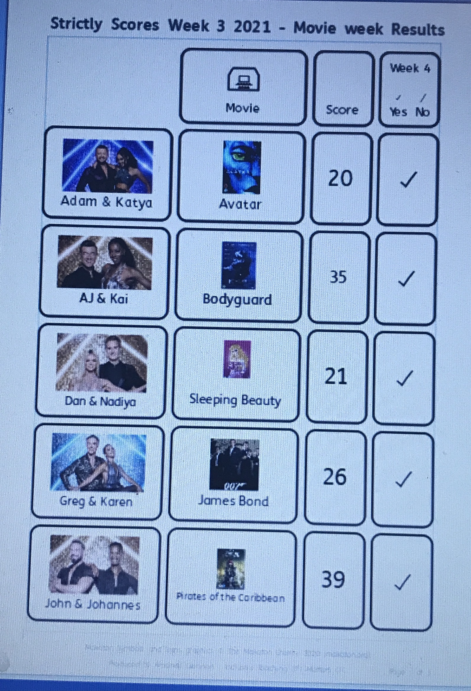 Simply note the scores, and tick who is in the dance off and who are winners ( through to the next week) Exciting stuff!